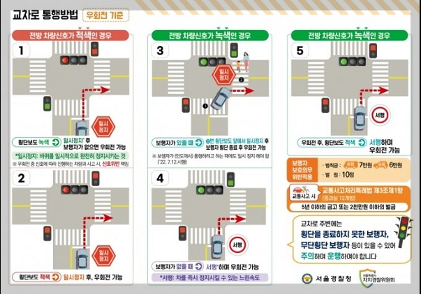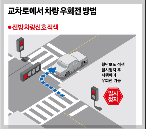 | 빨간불 우회전 | 신호가 빨간불일 때 | 정지 → 보행자 확인 → 서행 진행 | 반드시 정지 후 출발 |