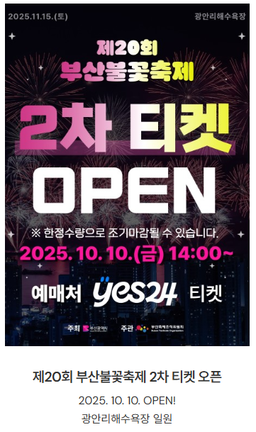부산 불꽃축제 예매는 공식 홈페이지 또는 지정 예매처(인터파크, 티켓링크 등)를 통해 진행됩니다.