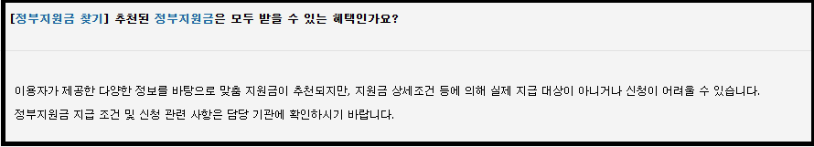 - 조회 결과에는 나의 연령, 직업, 소득, 가구 구성에 맞는 정부지원금이 표시됩니다.