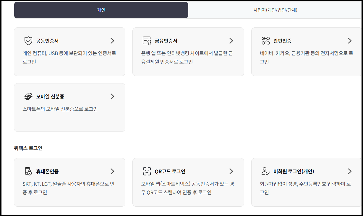 - 공동인증서 또는 간편 인증 로그인