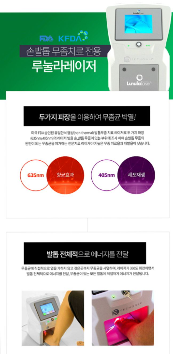 | 가열성(Thermal) 레이저로, '핀포인트' | 무좀균이 열에 약하다는 점을 이용해 60~70도의 고온을 발톱 깊숙이 전달하여 균을 직접 사멸 | |