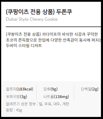 | 카다이프&버터 | 두바이 초콜릿 맛의 핵심이 카다이프면은 그냥 넣지 않습니다.풍미를 위해 버터에 튀기듯이 볶아서 사용하기 때문에 지방 함량이 수직 상승합니다. |