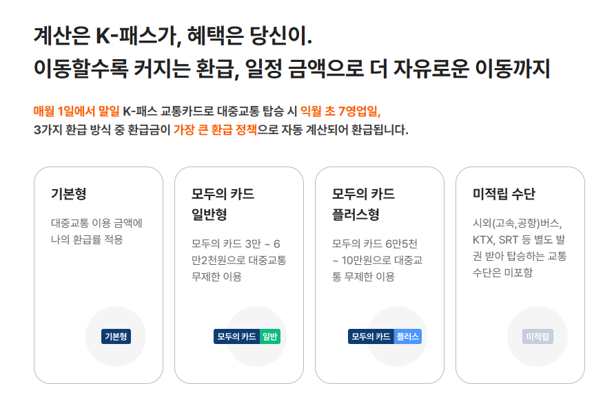 - 대상: 시내버스, 지하철, 광역버스, GTX 등 전국 단위 대중교통