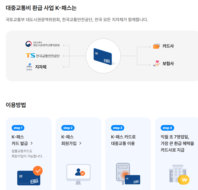 원하는 카드사(신한, 국민, 삼성, 현대, 우리, 농협, 하나 등) 홈페이지나 앱에서 **'K-패스'**를 검색해 카드를 신청합니다.